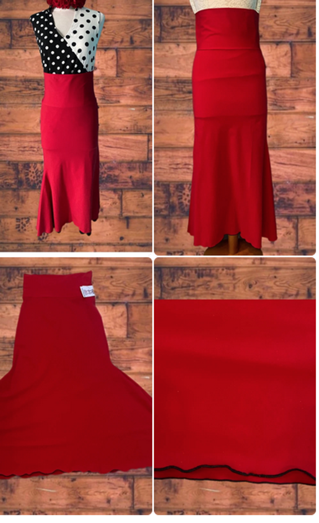 Magnifique jupe coupe sirène, d’un rouge intense et très élégant, qui sublime la silhouette.