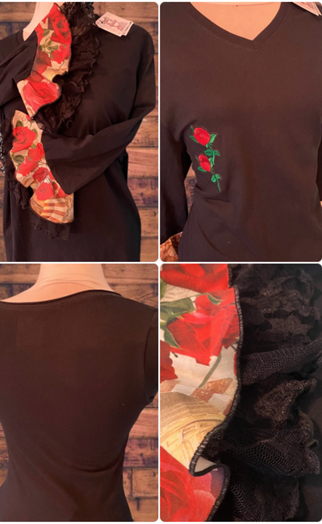 Un top élégant et expressif qui allie sobriété et raffinement. Le patch brodé et les manches travaillées en popeline florale et dentelle noire signent une pièce unique, inspirée de l’élégance andalouse.