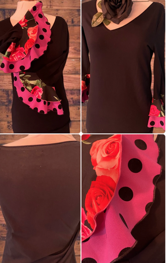 Un top élégant et original qui associe la sobriété du noir à l’énergie du fuchsia. Les manches fleuries à pois apportent une touche audacieuse et féminine, faisant de cette pièce un modèle unique et plein de caractè
