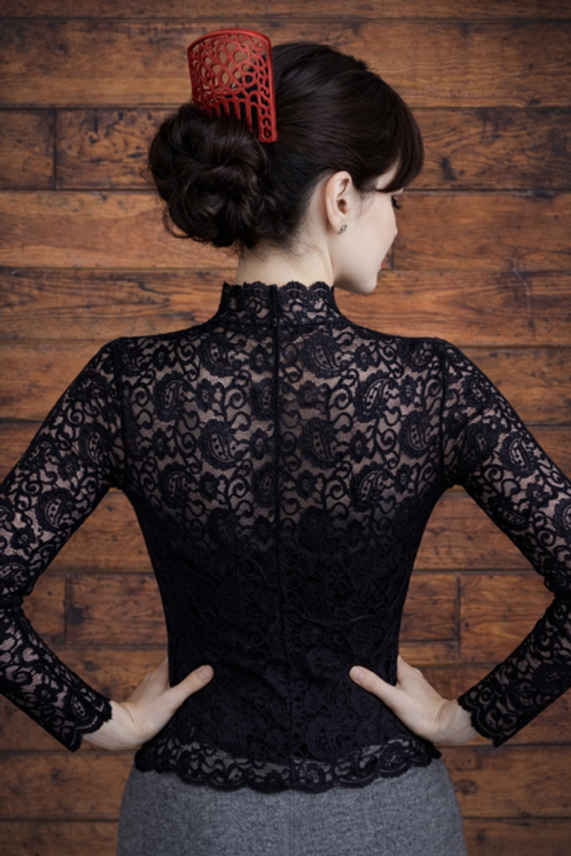 Top Femme Dentelle Noire – Col Montant Manches Longues