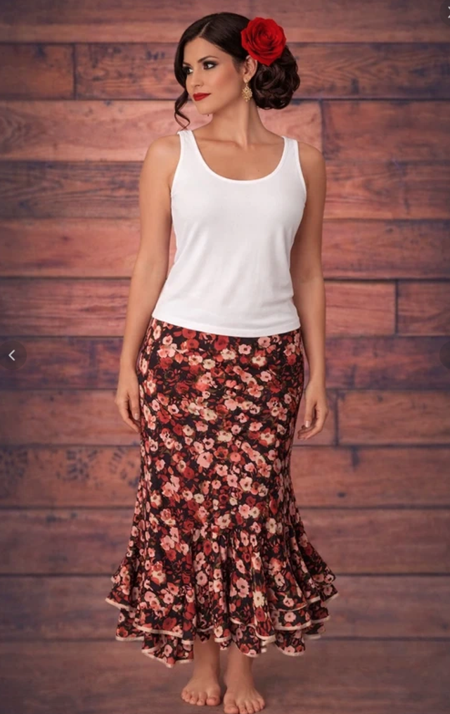 Magnifique jupe flamenco réalisée sur mesure en crêpe, offrant une silhouette élégante et un mouvement spectaculaire.