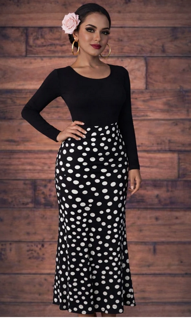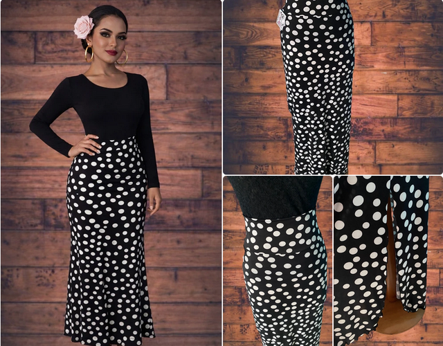 Élégante et intemporelle, cette jupe longue noire à pois blancs incarne l’esprit du flamenco et du style bohème chic. Sa coupe flatteuse épouse la silhouette tout en offrant une belle liberté de mouvement, idéale pour la danse comme pour une tenue affirmée.Ouverture coté