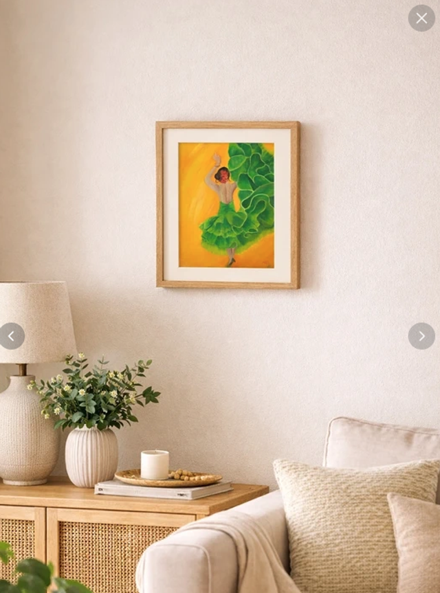 Apportez une touche artistique et chaleureuse à votre intérieur avec ce tableau illustrant une femme en mouvement, vêtue d’une robe verte aux formes végétales. Le fond jaune lumineux crée un contraste vibrant qui attire le regard et dynamise l’espace. L’ensemble évoque la nature, la liberté et l’élégance, parfait pour une décoration douce et contemporaine.