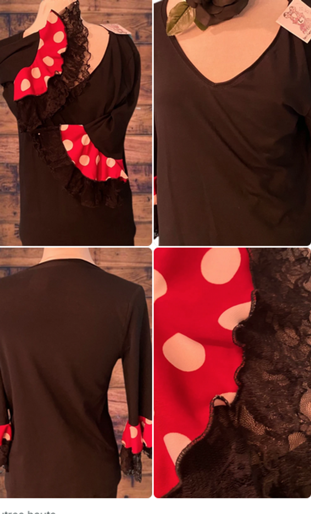 Un top sophistiqué et féminin qui allie la sobriété du noir à la passion du rouge à pois. La dentelle apporte une touche de sensualité et d’élégance, faisant de cette pièce un modèle unique et intemporel.